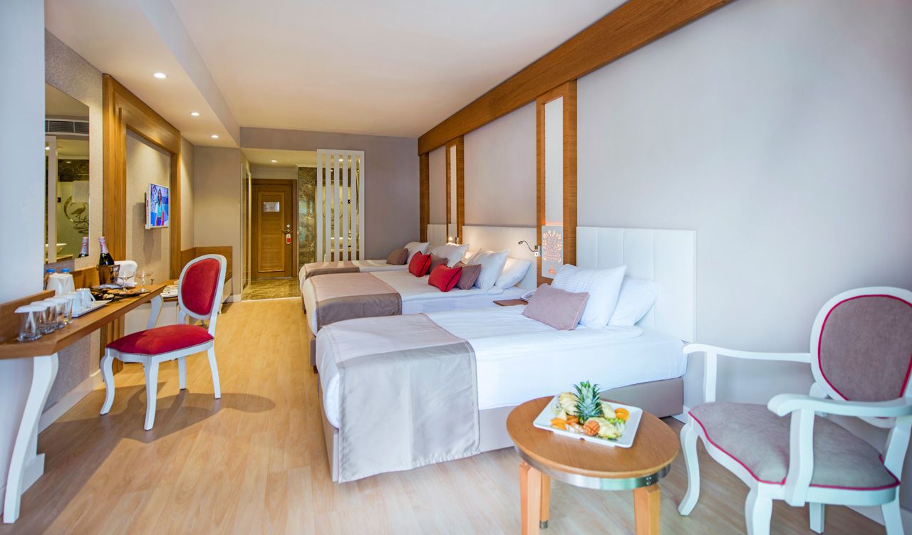 Отель находится прямо на берегу Средиземного моря, зеленая ухоженная территория, богатая инфраструктура, сервис высокого уровня и ориентированность на семьи с детьми – отличительная черта этого курортного места. К услугам гостей 5 бассейна, 2 из которых – детские, 2 водные горки, детская площадка и детское меню в ресторане. Детский клуб расположен на отдельной огороженной и охраняемой территории, работают аниматоры.