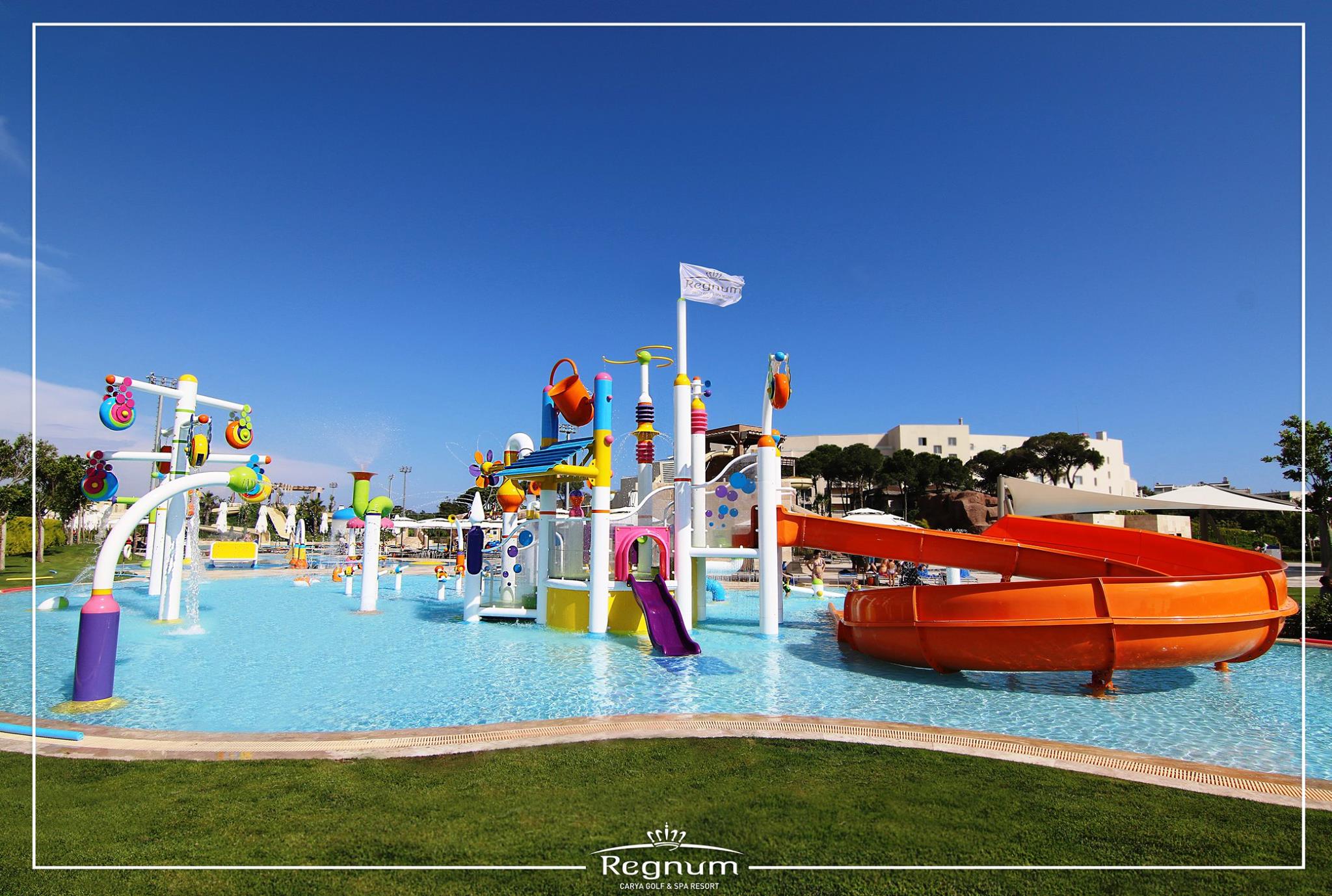 Отель Regnum Carya расположен на берегу Средиземного моря с обслуживанием по системе «все включено», предлагает отдыхающим собственный пляж с чистым песком и всем необходимым для морского отдыха. На зеленой территории в 100 гектаров расположены корпуса и эксклюзивные виллы – можно выбирать, где жить. На территории отеля есть аквапарк, бассейны, спа-центр, теннисные корты, гольф-клуб, детский парк приключений, игровой клуб. Специальное предложение от отеля для детей от 6 до 16 лет — футбольная школа Chelsea. В ресторане есть детское меню, а так же детские буфеты.